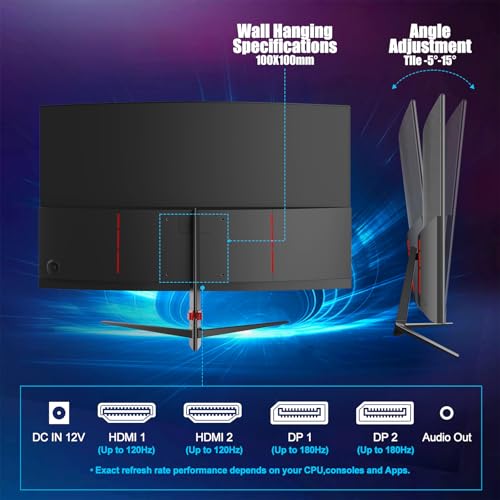27 Inch Gaming Curved Monitor, 180Hz QHD 2560x1440p PC Monitor with AMD FreeSync, Flicker-Free, HDMI 2.0, DP 1.4, Ultra-Thin Frameless 2K Computer Screen