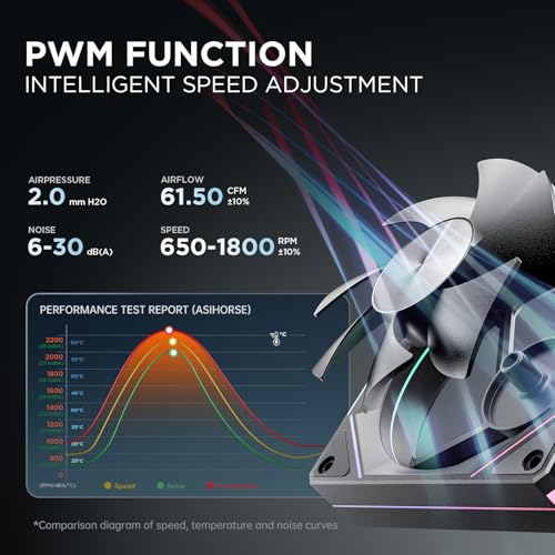 【Noise Reduction Design】 The 120MM fan features a max noise level of 30 dB(A). Its 9-blade design and high-quality plastic reduce wind noise and vibration. Rubber pads and balancing adjustments further make stronger noise reduction, creating a peaceful environment.