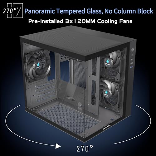 MATX PC Case,270° Panoramic Tempered Glass Panel Gaming PC Case,3 Fans Pre-Installed Micro-ATX Computer Case,USB 3.0,Black(V3)
