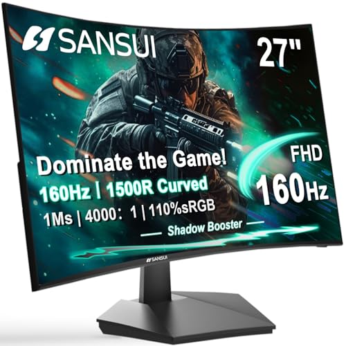SANSUI 27 Inch Curved Gaming Monitor 160Hz FHD 1080P, 1500R Curved Computer Gaming Monitor 4000:1, 110% sRGB, FPS/RTS, 1Ms MPRT|FreeSync|HDR|Low Blue Light|HDMI DP| VESA Support, HDMI Cable Incl.